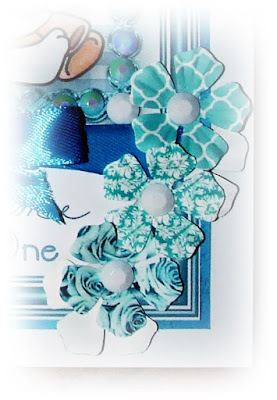 I also added a digital sentiment, as well as a blue cs mat, ribbon, gems and punched and embossed flowers